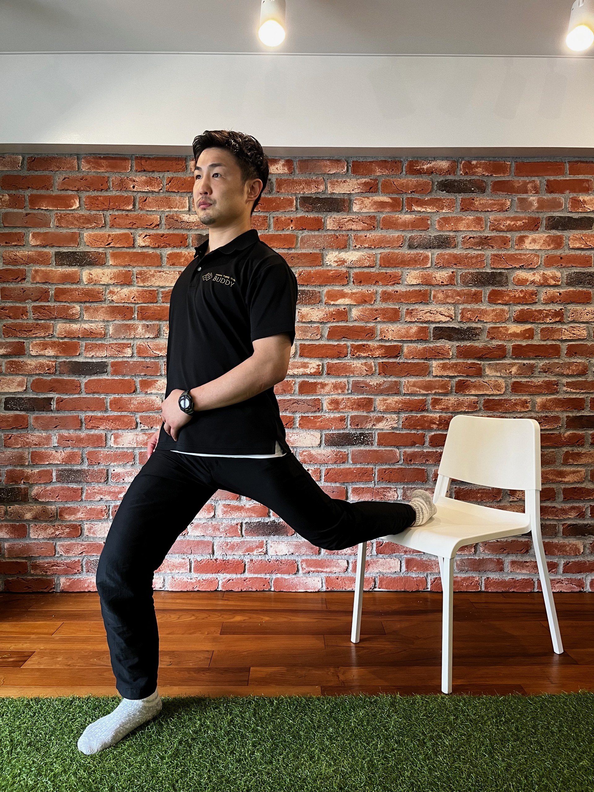 イスに背を向け、左脚の爪先(足の甲)をイスに乗せる。右脚は膝を曲げて前方へ出す。