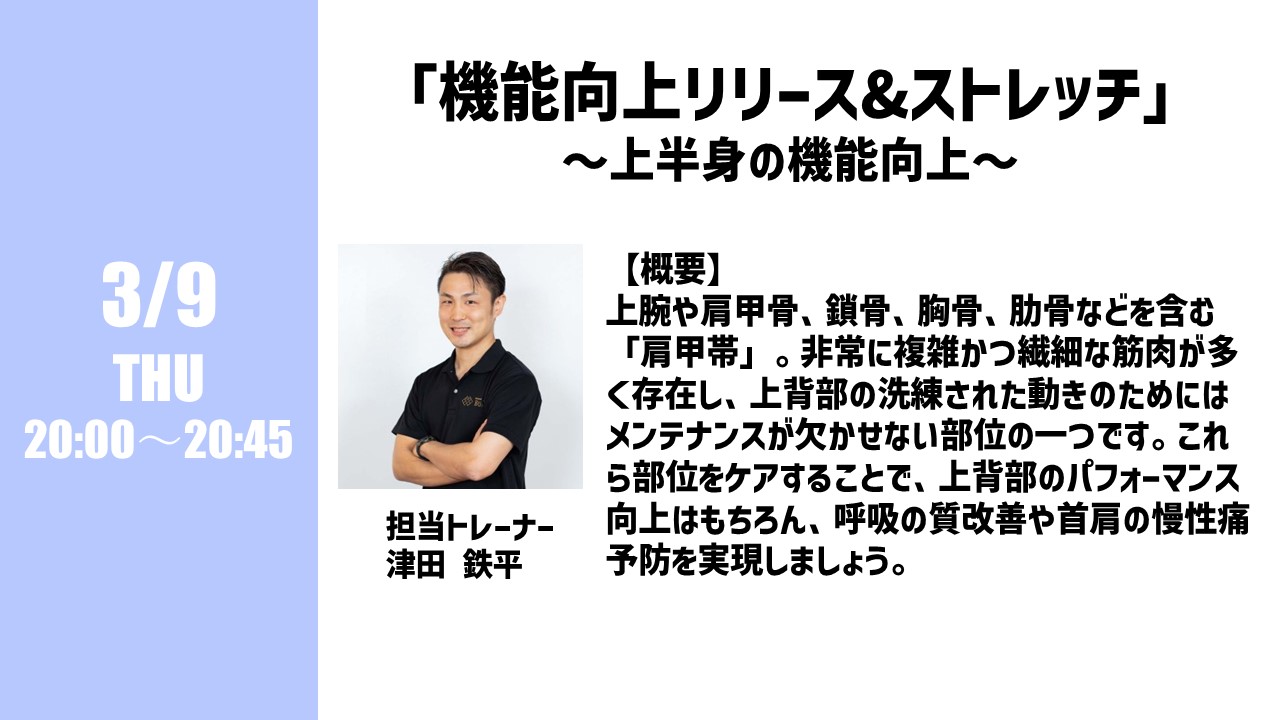①9日(木)20:00~20:45「機能向上リリース&ストレッチ」〜上半身の機能向上〜by津田