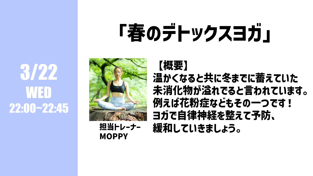 ③22日(水)22:00〜22:45「春のデトックスヨガ」by Moppy
